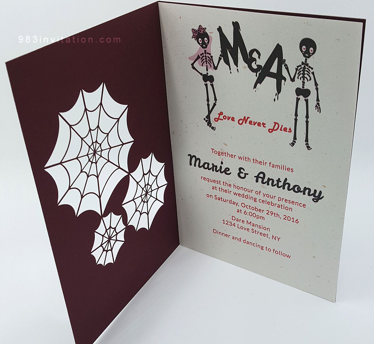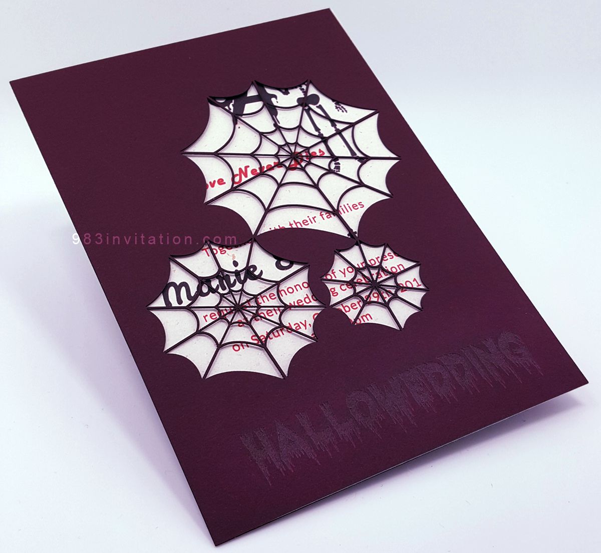 This is a symbolic and beautiful Halloween wedding invitation. In this design, we do not try to add something very scary. Instead, we attempt to create the mood and atmosphere by using a symbol of Halloween, the spiderweb. The technique of laser cutting to create 3 spiderwebs on the cover of the invitation. This would help to create the atmosphere and tell your guests that it is going to be a Halloween wedding. Besides the web, the word “HALLOWEEN” is put on the cover by using laser engraving.